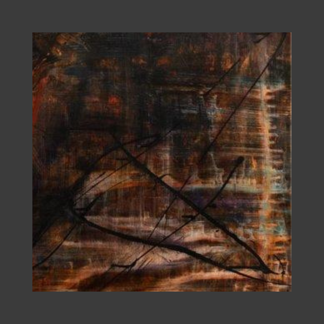 The background, rendered in abstract textures using acrylic paint, contrasts sharply with the realistically depicted red ibis in the foreground. The ibis, a bird steeped in symbolic and spiritual meaning, is portrayed mid-flight, representing the upward trajectory of healing and moving forward. The copper-colored line trailing the ibis symbolizes the ascent towards a brighter future, free from the shackles of the past.