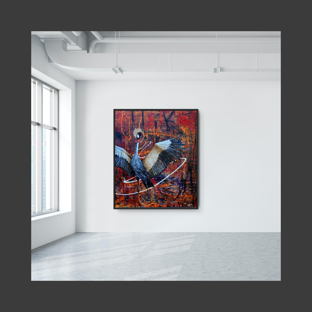 The crane emerges majestically from a vibrant, graffiti-inspired backdrop of fiery reds, deep oranges and hints of purple, representing the chaotic energy of life's unpredictable changes. The bird's elegant form stands in perfect contrast to the turbulent background, capturing the essence of finding strength and beauty in the midst of chaos.